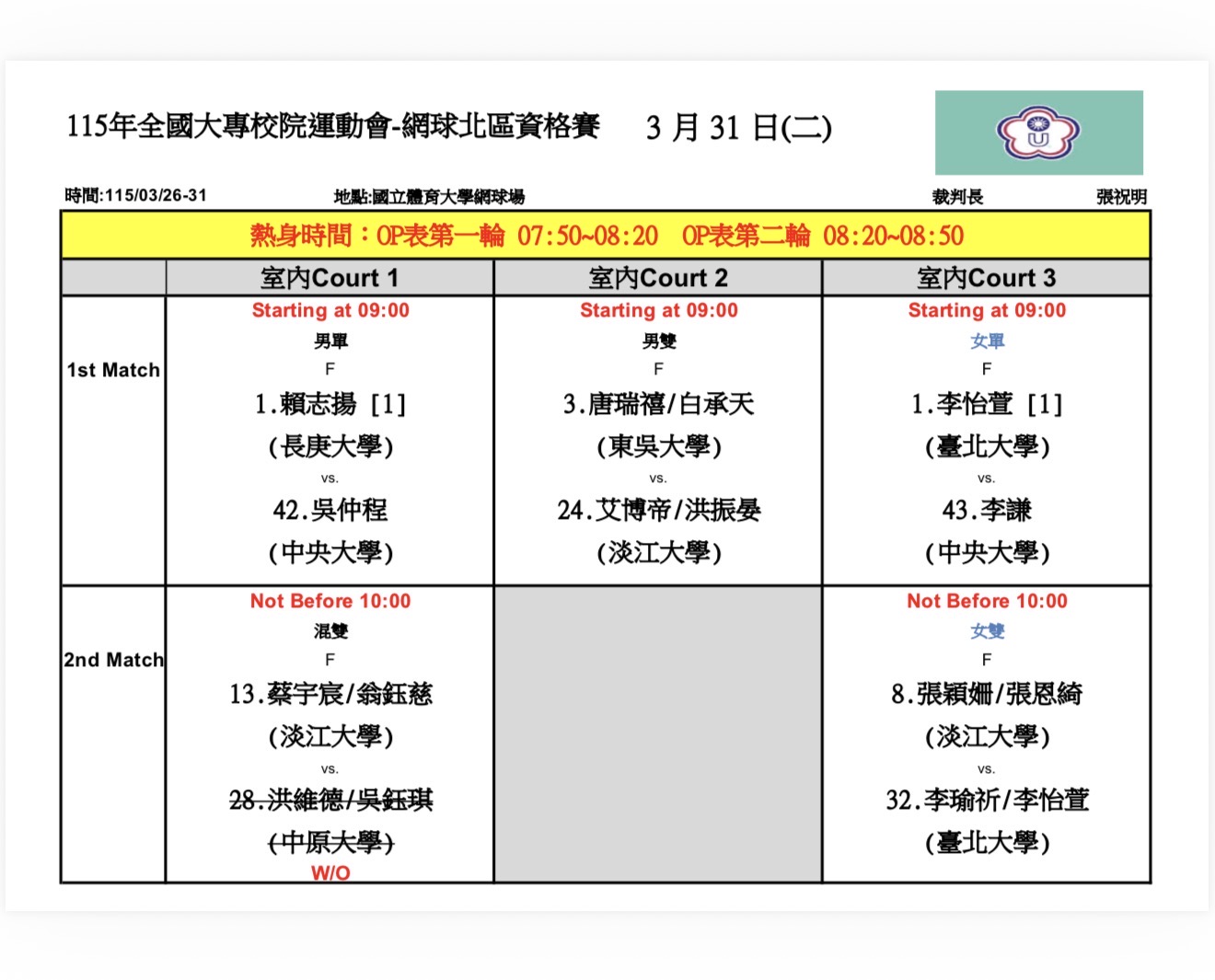 115年全國大專校院運動會-網球_北區資格賽賽程表3/31